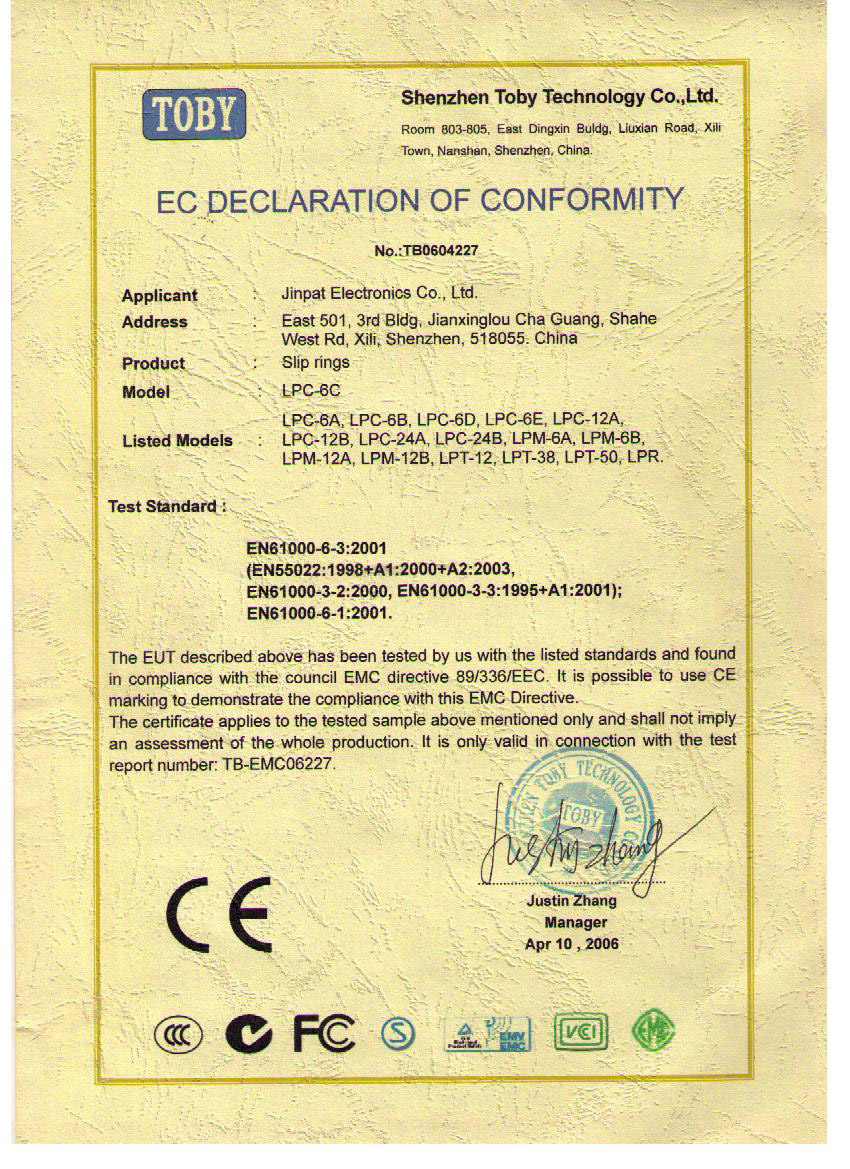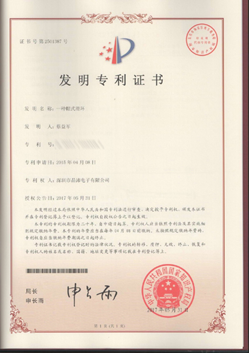 晶沛通過(guò)了歐盟CE認(rèn)證、FCC認(rèn)證、SGS認(rèn)證、BV“船級(jí)社”認(rèn)證、防爆認(rèn)證等多項(xiàng)認(rèn)證,生產(chǎn)的導(dǎo)電滑環(huán)都符合RoHS環(huán)保要求,先后被授予“國(guó)家高新技術(shù)企業(yè)”稱(chēng)號(hào),目前已獲得45項(xiàng)專(zhuān)利,其中發(fā)明專(zhuān)利6項(xiàng)。